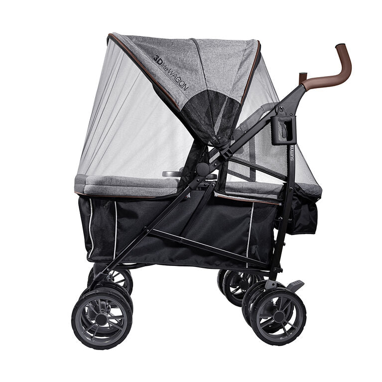 Roll into all of your family's adventures with the Summer 3Dlite Wagon. This lightweight but durable stroller wagon features a full-sized seating area that safely accommodates two little ones while providing plenty of space for whatever you need on your journey. Made with recycled fabrics, this wagon stroller features the signature 3Dlite compact fold and auto-lock, ideal for travel or storage when not in use. Keep squabbles to a minimum thanks to two individual trays and cup holders, which give each kid their own space to enjoy snack time. Children will be safe and secure thanks to 3-point safety harnesses and anti-shock front and rear wheels. Additional features include a removable sun canopy with zip-out mosquito nets, a rear storage basket, plus a cup and cell phone holder for parents. Whether your family is headed to the beach or just down the street, you can get there a little easier with the Summer 3Dlite Wagon for kids!