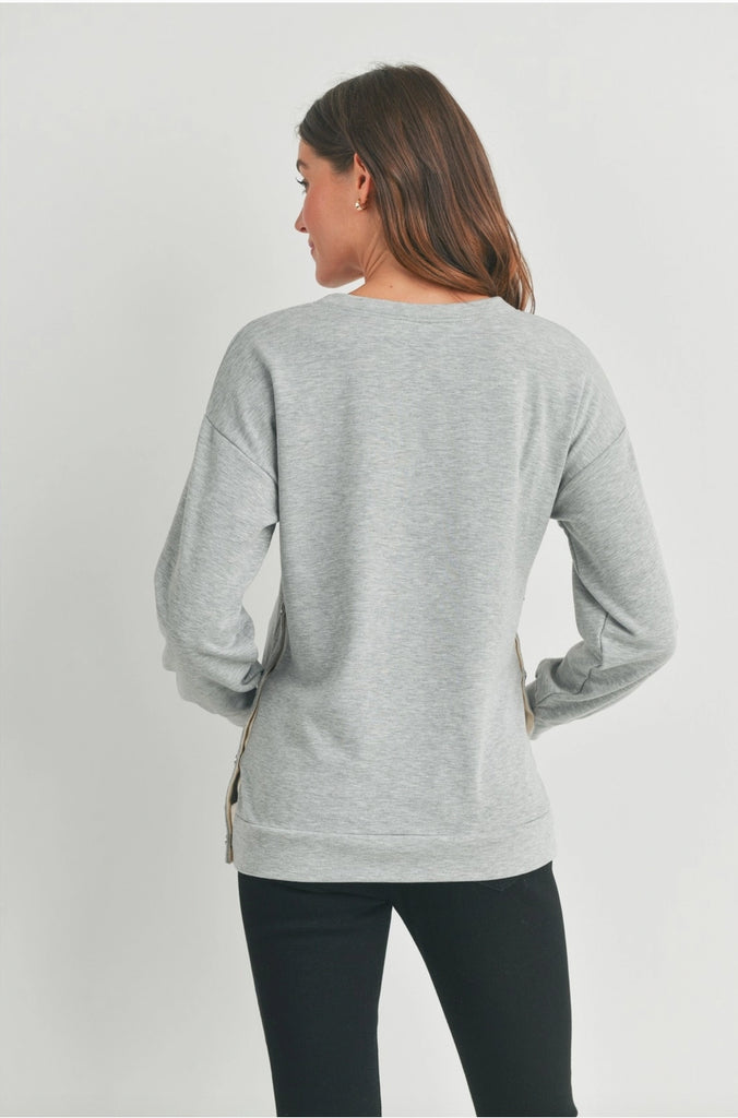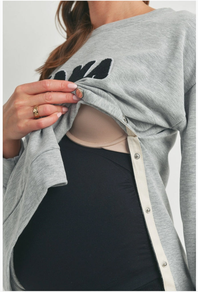 This is a cozy and soft sweater with snaps up the sides for extra room for your bump & access to breastfeeding. Pair with leggings, sweats or your fave jeans.